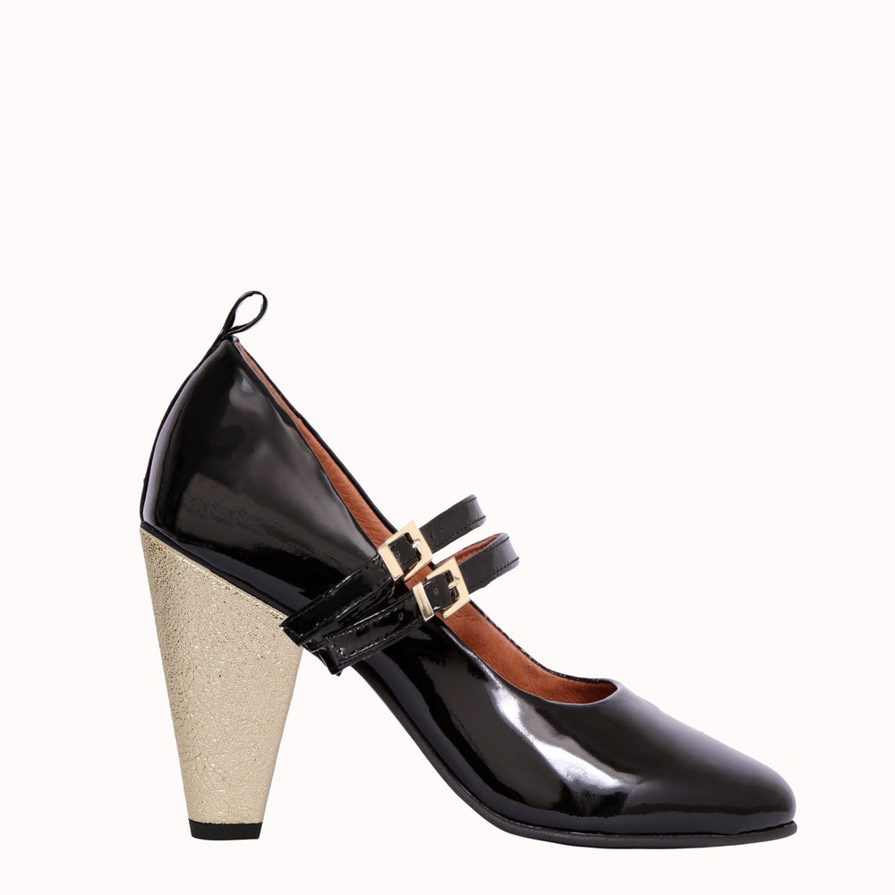 - Double bride cou-de-pied en cuir verni noir à boucle dorée à pression amovible