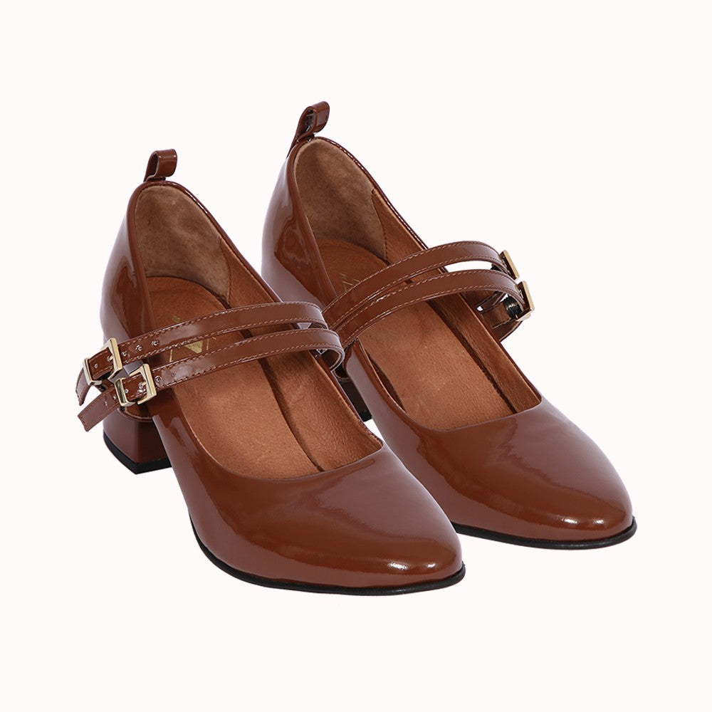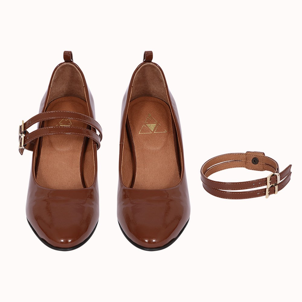 - Double bride cou-de-pied en cuir verni marron à boucle dorée à pression amovible